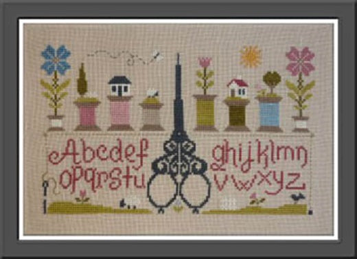 A cross stitch pattern design by Nathalie Cichon, for Jardin Prive. Translates to Scissors and Bobbins. Uses DMC Threads.